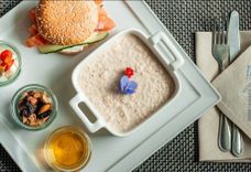 441 г • овсяная каша, булочка с сезамом, подкопченная семга, домашний сыр, ореховая смесь с изюмом, мед