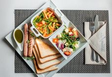 401 г • пшеничный хлеб, салат с томатами, сыром и соусом песто, колбаски из птицы, мини морковь, стручковая фасоль