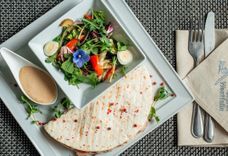 245 г • мексиканская тортилья с индейкой, салат с овощами гриль, медово-горчичный соус